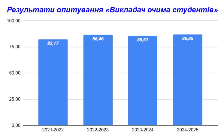 За результатами опитування «Викладач очима студентів» середній показник за 4 роки становить 85,25 бала зі 100 можливих, що відповідає високому рівню професійної діяльності та позитивному сприйняттю викладання студентською спільнотою.